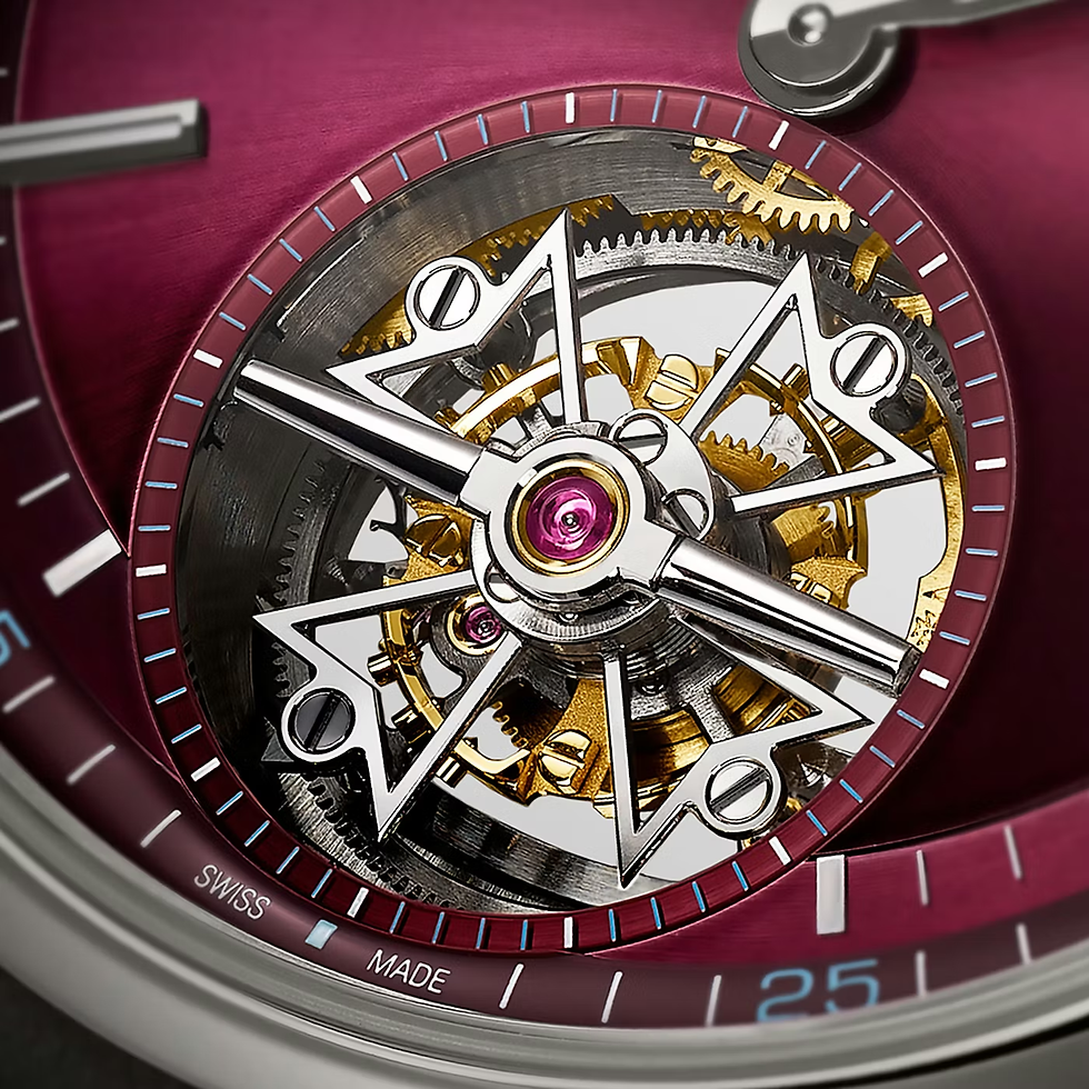 La carátula es la gran protagonista. El tono rojo dirige la mirada directamente al tourbillon de un minuto, alojado en una jaula con forma de cruz de Malta. Un solo tornillo ennegrecido cumple la función de segundero, un detalle técnico que también aporta dinamismo visual. Los índices aplicados en oro blanco y la impresión en blanco y azul claro equilibran el conjunto, mientras que el realce con laca mate añade profundidad.