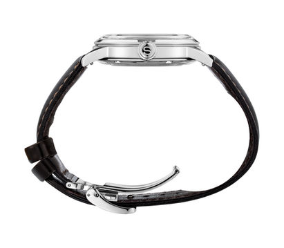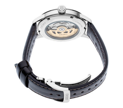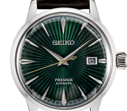 De la Colección Presage. Ofreciendo lo mejor de la relojería mecánica japonesa, la colección Presage combina tecnología de precisión con una artesanía y un diseño excepcionales. Inspirado en cócteles clásicos, este sofisticado reloj presenta una carátula verde intenso con patrón estampado y acabado brillante, aguja segundera dorada y calendario de fecha. El fondo de caja transparente con cierre de rosca permite apreciar el movimiento de 23 joyas, con capacidad de cuerda manual y automática, que late a 21,600 vibraciones por hora y ofrece una reserva de marcha de aproximadamente 41 horas. Fabricado en acero inoxidable, este elegante guardatiempo incluye un cristal abombado, correa de cuero marrón y un broche desplegable triple con botón de liberación. Resistente al agua 5 bares, 50 metros.