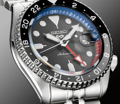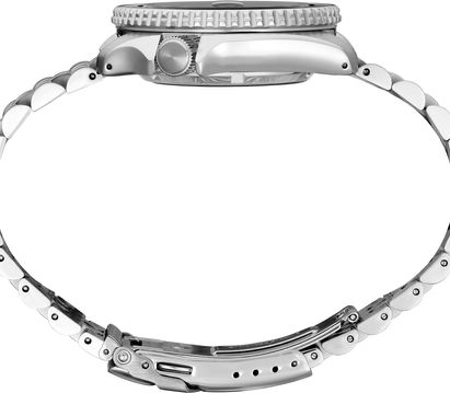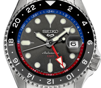 Seiko 5 Sports SKX Sports Style GMT Series. Añadiendo un nuevo nivel de elegancia al diseño clásico deportivo/de vestir, este dinámico reloj ofrece una variación fresca del popular estilo “SKX”. Equipado con tecnología automática que se activa con cada movimiento, este versátil guardatiempo es impulsado por un movimiento de 24 joyas que late a una frecuencia de 21,600 vibraciones por hora, con una reserva de marcha de aproximadamente 41 horas y capacidad de cuerda manual. La carátula gris presenta manecillas e índices luminosos audaces, un calendario de fecha con lupa y una prominente aguja GMT roja para una visibilidad instantánea. Está enmarcada por un llamativo bisel GMT bicolor en gris y negro. Un brazalete estilizado de cinco filas en acero inoxidable, con broche desplegable triple y cierre de seguridad, añade textura y comodidad, mientras que la caja de acero inoxidable incluye un fondo transparente con cierre de rosca que permite observar el clásico mecanismo en acción. Resistente al agua 10 bares, 100 metros.