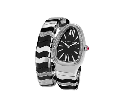 La caja del Bulgari 102129, con sus 35 mm de diámetro, destaca por su meticulosa elaboración en una fusión de cerámica y acero inoxidable, que combina resistencia y una estética refinada. Un bisel engastado con gemas le confiere un toque de lujo, mientras que el fondo de zafiro resistente a los arañazos permite admirar el intrincado movimiento en su interior.