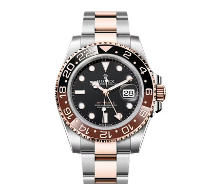 Este modelo presenta una esfera negra y un bisel Cerachrom bicolor de cerámica marrón y negra. Además de las agujas convencionales de horas, minutos y segundos, el GMT-Master II incorpora una aguja con punta de flecha que gira alrededor de la esfera cada 24 horas, así como un bisel giratorio bidireccional graduado de 24 horas.